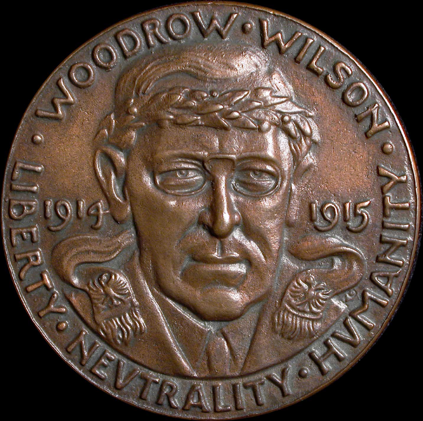 Obverse: Facing laureate bust of President Wilson dividing dates 1914-1915. In border, “Woodrow Wilson Liberty – Neutrality — Humanity”.