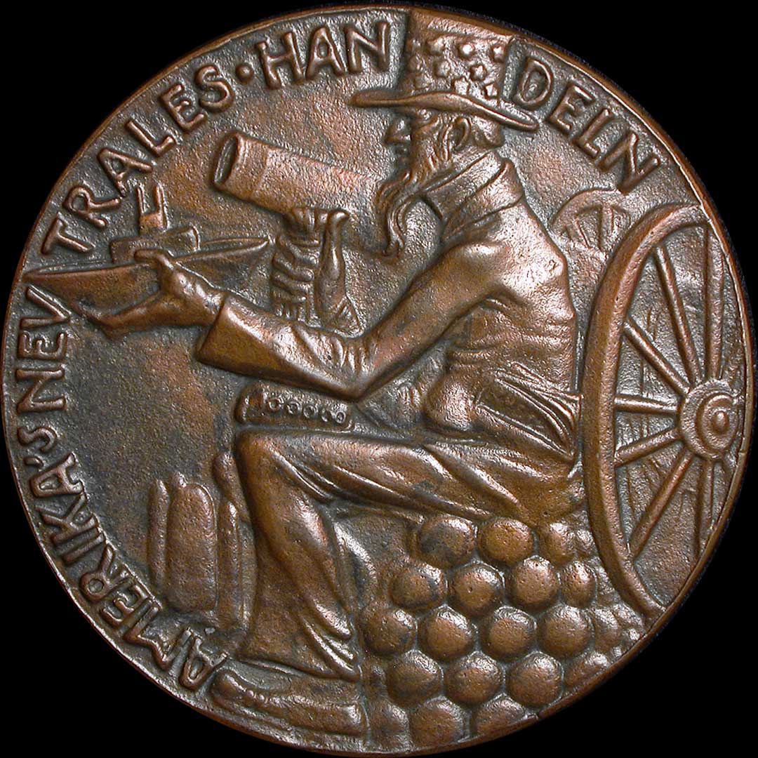 Reverse: Uncle Sam leaning against a cannon, seated on a pile of shells, in 1eft hand a warship, in his right hand a bag of money marked 100.000. In border, “Amerika’s neutrales handeln” (America’s neutrality bargain).