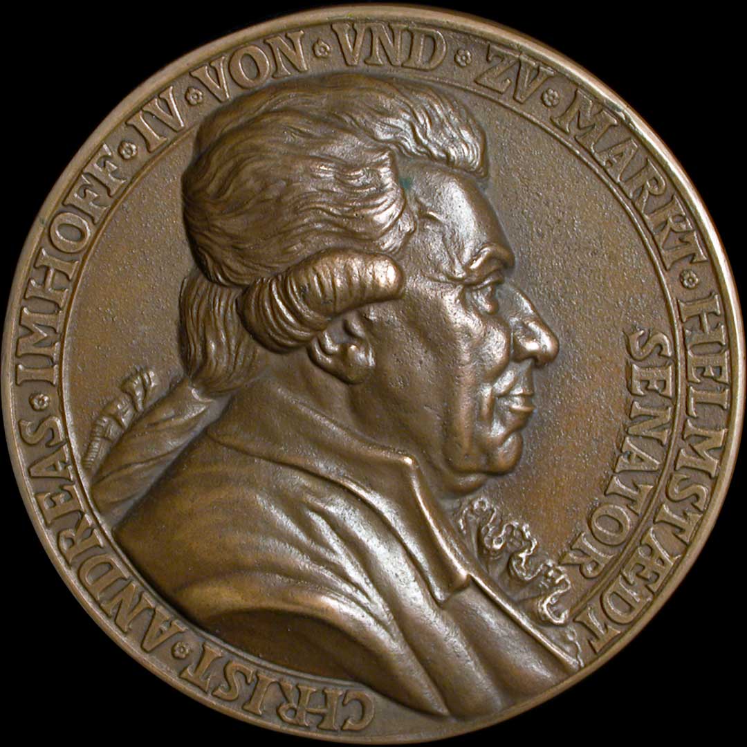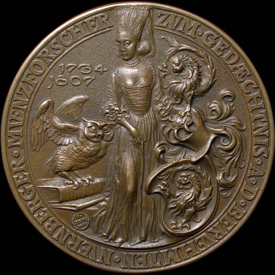 Obverse: Bust, right, wearing powdered wig and finery with ruffles. Latin inscription surround (In Memory of the famous numismatist of Nuremburg. Inscription: Christian Andreas Imhoff on the Nuremberg numismatic . Breast image / Woman between owl on books and family coat of arms.