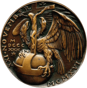 Gies claimed during the censoring investigation that this medal was made to warn the Italians about the “German God of War” if they followed through with fighting the Austrians. His arguments were unconvincing and the medal was banned by the German High Command soon thereafter. It is likely that Gies created the medal to show the general war-mongering mood evident throughout Europe at the beginning of the war. It was also a subtle jab towards the bellicose German nationalists and state propaganda.