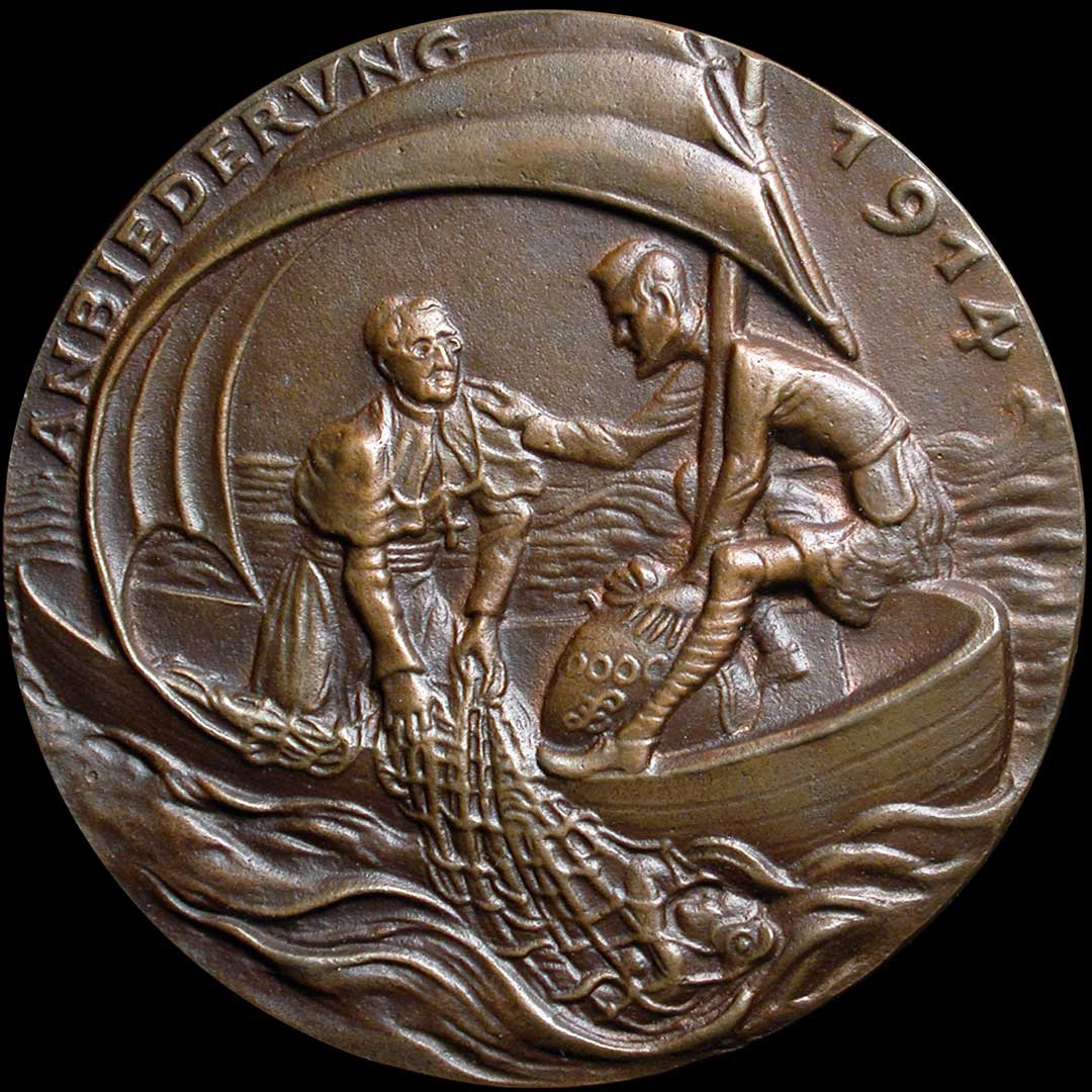 Reverse:  The Pope, in a sailboat, hauls the lost Marianne (France) in with his fishing net.  An English Tommy, sitting in the front of the boat, tries to persuade the Pope to give him an ambassador’s position at the Papacy using money as a bribe. Inscription, “Anbiederung” (Uninvited Introduction). Dated 1914.